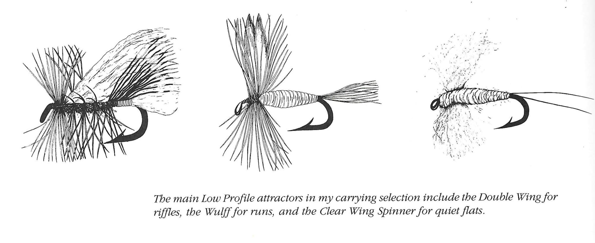 For fast riffles, Gary's favorite is his Double Wing, and other flies that present a wide noticeable profile. For moderate runs, Gary likes Wulffs and favors tall flies that play off of the mirrored reflection of a fly on waters surface, while on slow water, attractors should ride low in the column. Here he favors oversized spinners and odd-ball patterns like the Mohawk.