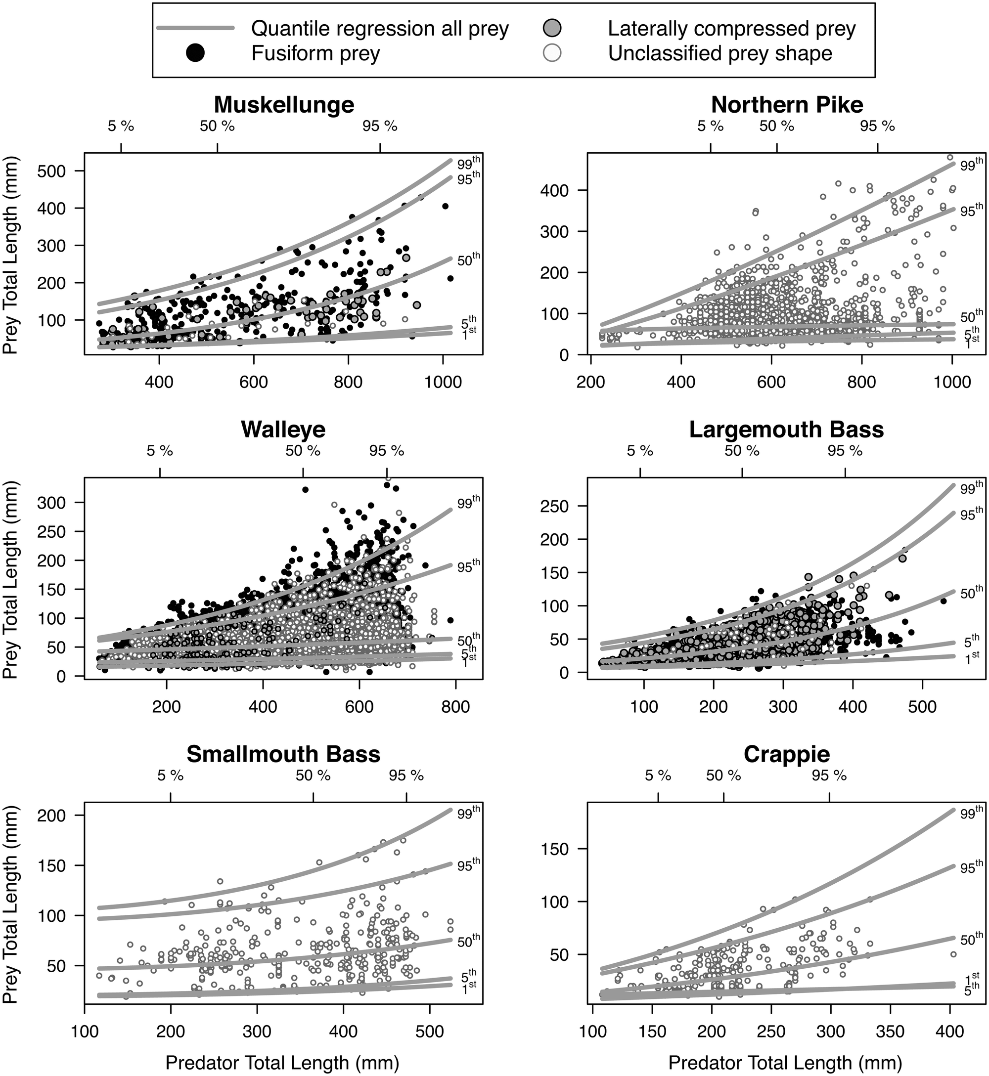 Using diet data (stomach samples) collected between 1988-2003 for crappie, largemouth bass, muskies, pike, smallmouth, and walleye, scientists identified relationships between predator size and prey size. Based on their findings, for all fish, except large muskellunge, predators most commonly consumed prey between 0.5 to 3 inches. Maximum prey size ranged from 32-46% of the predator's length.