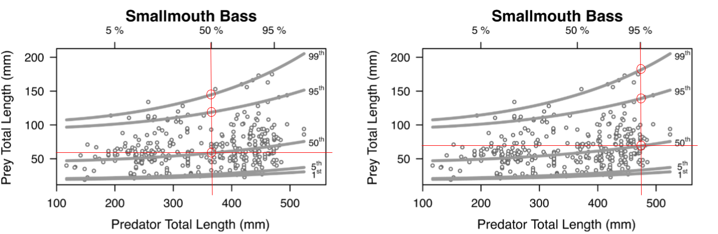 Let's take a closer look at one species chart to explain what's going on more clearly. Exploring the trends in smallmouth bass, notice how the 50% quantile bass (graph on the left), around 375 mm (14") eats about the same number of prey items that are larger and smaller than 60 mm (2.25"). That's represented by the 50th quantile grey line. Now consider the 95th quantile prey size for the same size fish. The size of that prey/fly is somewhere around 100 mm (~4"). For a 14" bass, only 5 in 100 fish ate a fly larger than 4 inches... statistically speaking.