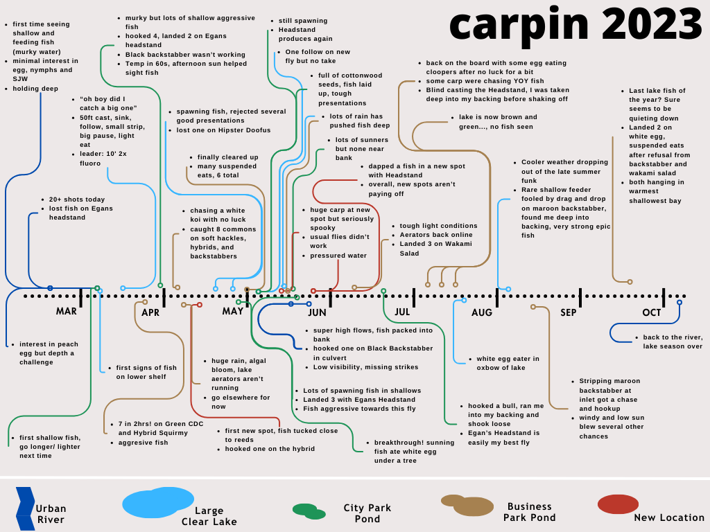 So, we chased urban carp around for two year at a set of fixed locations, checking in regularly, and logged details to each encounter, all in an effort to improve our understanding of how urban carp tick, and also to share our knowledge. We picked several types of carp habitat to observe, including an urban river system, a large clear lake, a small city pond fed by a ditch, a small business park pond fed by recycled water, and even occasional new locations as outside reference points. As a taste, here is a timeline from just last year...