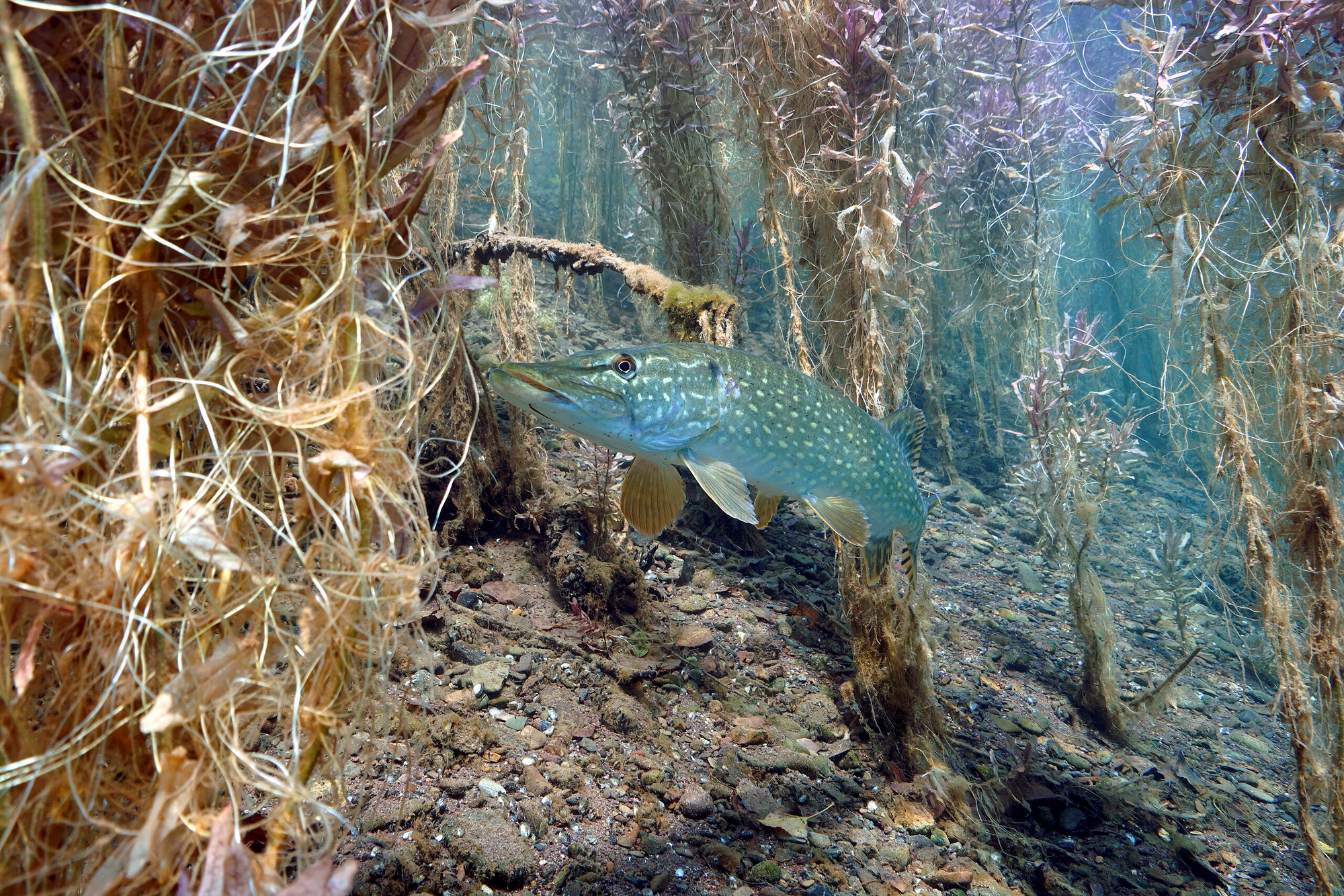 Pike like to live in weeds, so naturally they take on an appearance to match their surroundings. Their camouflage necessarily reflects their habitat preferences, and also indicates their hunting style: blending in before ambushing prey.