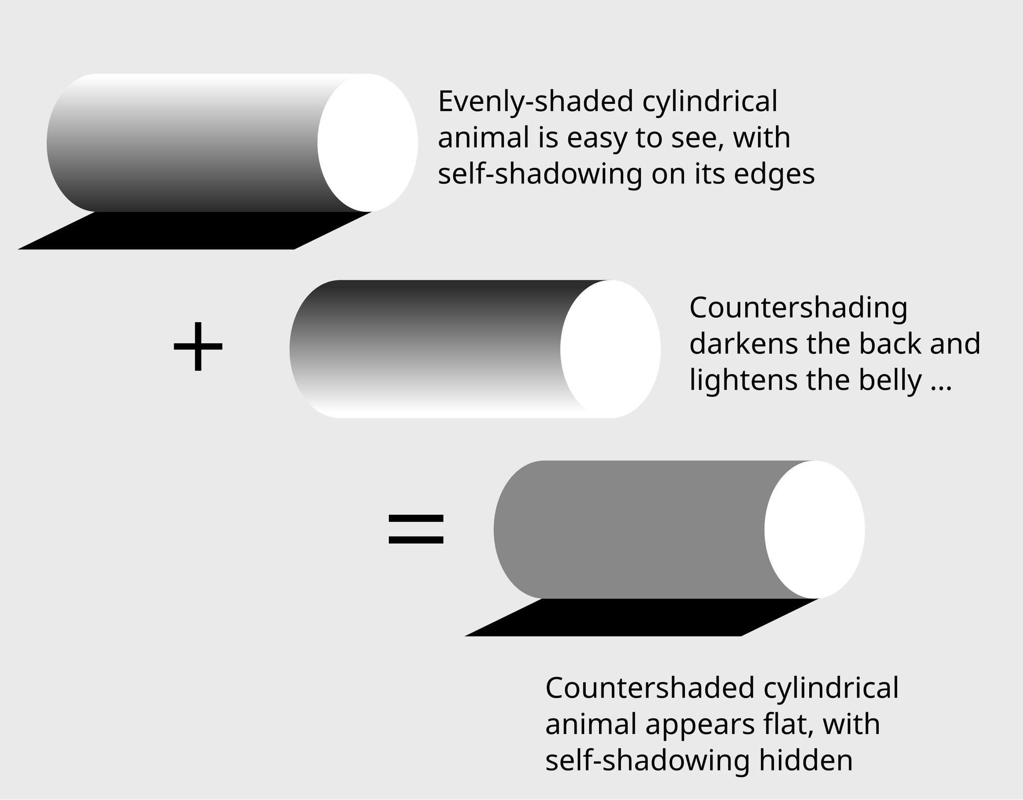 Countershading, a camouflage where an object is darker on top and lighter on bottom is common amongst many fish. In 1909 Abbott Handerson Thayer discovered that countershading is a widespread phenomenon in the natural world, and seems to have evolved to counteract the natural self-shading effect of overhead sunlight. When light falls on an object from above on a three-dimensional uniformly colored object, a gradation appears making the top of the object appear lighter, and the bottom of the object darker. To counteract the self-shadowing, fish developed darker dorsal patterns compared to lighter lateral and ventral shading (their sides and belly). The result is a fish that appears less 3-dimensional and more flat, helping to blend into their surroundings, instead of standing out.